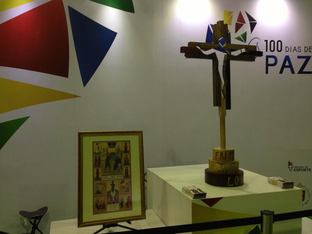 At the end of Mass, the Olympic Peace Legacy was passed on to the Church in Brazil as it now prepares for the 2014 World Cup and the 2016 Olympics. Two symbols were presented to Bishop Henrique by way of encouragement and challenge to keep the the peace flame alive: a print copy of the Pax Christi ICON of Peace which had been a focus of prayer and inspiration in 17 parishes and two Cathedrals during the 100 days; and this wooden Olympic cross used in the Joshua Youth Camp in London.