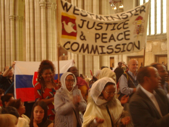 The Migrants Mass 2015 was a huge success, with nearly 1500 in the Cathedral, and the banner procession way along the road as they came in. We were not counting how many nationalities and ethnic groups there were, but the banners just kept coming. The music was a highlight for me, with Frances Novillo leading. We had hymns from Congo, Slovakia, Cameroun, China and more, but the one that stole the show was the Nigerian chant after the Communion, ‘All I want to say is Thank you Lord’! It had us all on our feet, clapping and dancing. Archbishop Peter Smith gave a clear statement of the Catholic position on migration, trafficking, detention and race, flagging up the necessity of balancing the pressures of immigration with the common good. Along with the Cardinal and several bishops from the London area, the Mass was attended by many London mayors, some ambassadors and 2 MPs. A reception was provided afterwards in honour of the 175th anniversary of the Tablet newspaper and the Mass’s own tenth anniversary. The exotic food supplied by the ethnic chaplaincies and the Justice and Peace Commisions disappeared quite speedily alas!