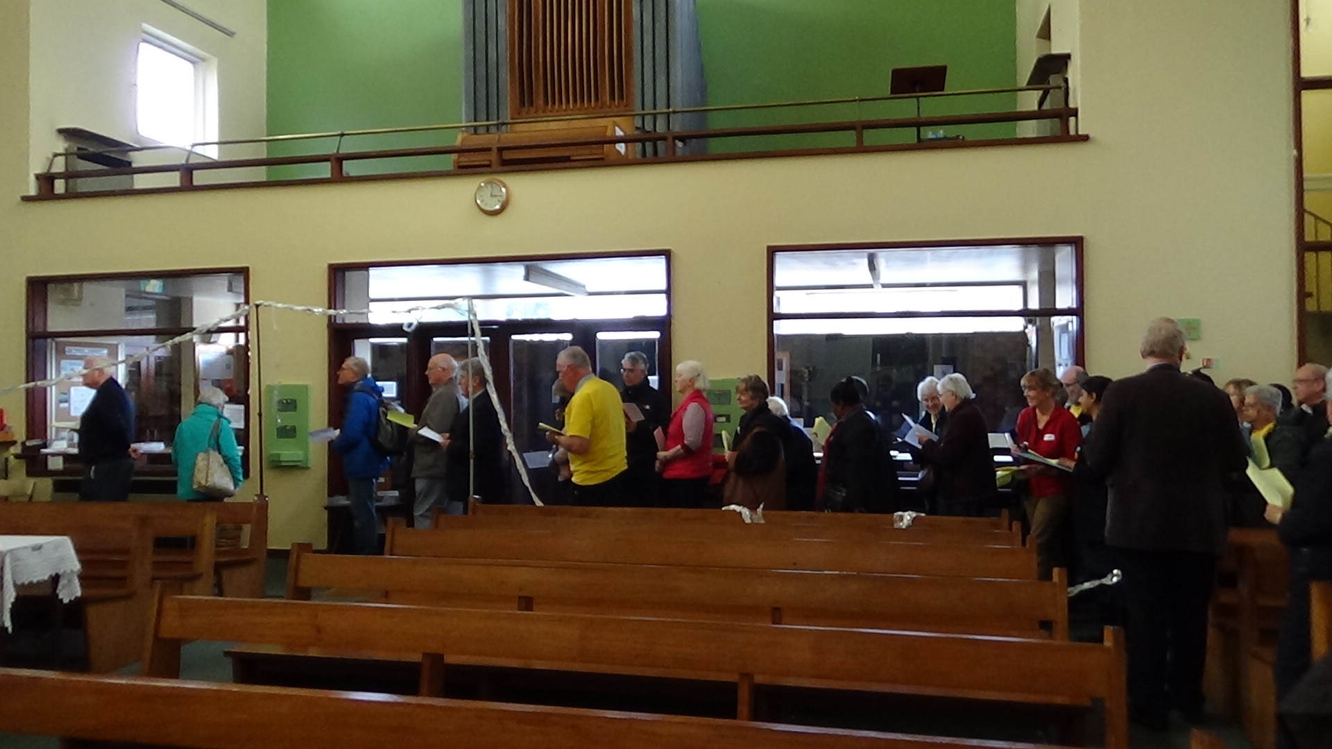 The audience was then led over to the Church for a ‘Cosmic Walk’, a symbolic journey starting with the Big Bang, following a ribbon stretching round the outer aisles, with nothing happening for over half the length, and then the stages of creation marked in appropriate stages, human life appearing at nearly the end of the ribbon – a humbling position! We meditated on our place in creation, reminded by Sean that each has its own intrinsic value, which is not decided by humanity, but by God. Laudato Si indeed.