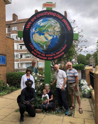As we see Christ in the whole planet we see that we are crucifying Him again by our ignorance and callous disregard for the interconnectedness of all creation. Many, in our western society in particular, have been asleep to the looming climate crisis and because of all the instant gratification and distraction offered by consumerism and the accelerated pace of life, have become lost and detached from the slower rhythms of nature. Therefore, we have been called to wake up, return and reconnect. These are perhaps more accessible words than repentance and healing for those who do not share our faith. My hope is that this is a piece of art which will speak to everyone in the local community.
