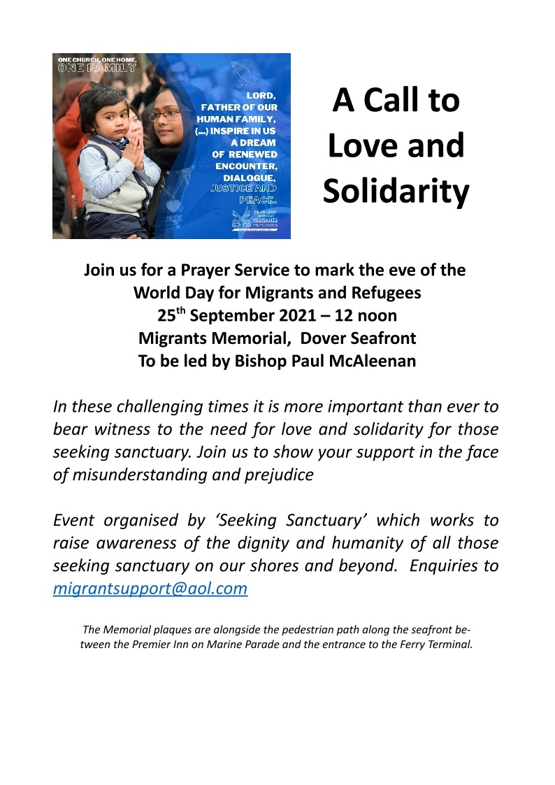 The annual International Mass on the World Day of Migrants and Refugees will be celebrated by Bishop Paul McAleenan at Westminster Cathedral, Victoria St, London SW1P 1LT, UK.