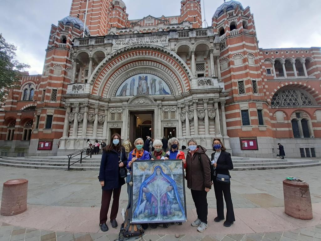 The purpose was to pray and distribute prayer cards with artist Helen Elwes’ “Mother of Mercy” painting. Thanks to the efforts of Helen and Sr Zoe Leadbetter and the help of various benefactors a big number of these cards has been printed. The hope is that the distribution of this image will help stimulate our Catholic imagination and prayer for our wounded earth. The painting shows Mary, the Mother of Mercy, holding her mantle over all creation, including animals that have become extinct. In the background there are forest fires showing the damage we are doing to the earth. Leaflets about the climate and ecological emergency and the 40 days of prayer before the launching of the Laudato Si’ Action Platform (14th November 2021) were also handed out.
