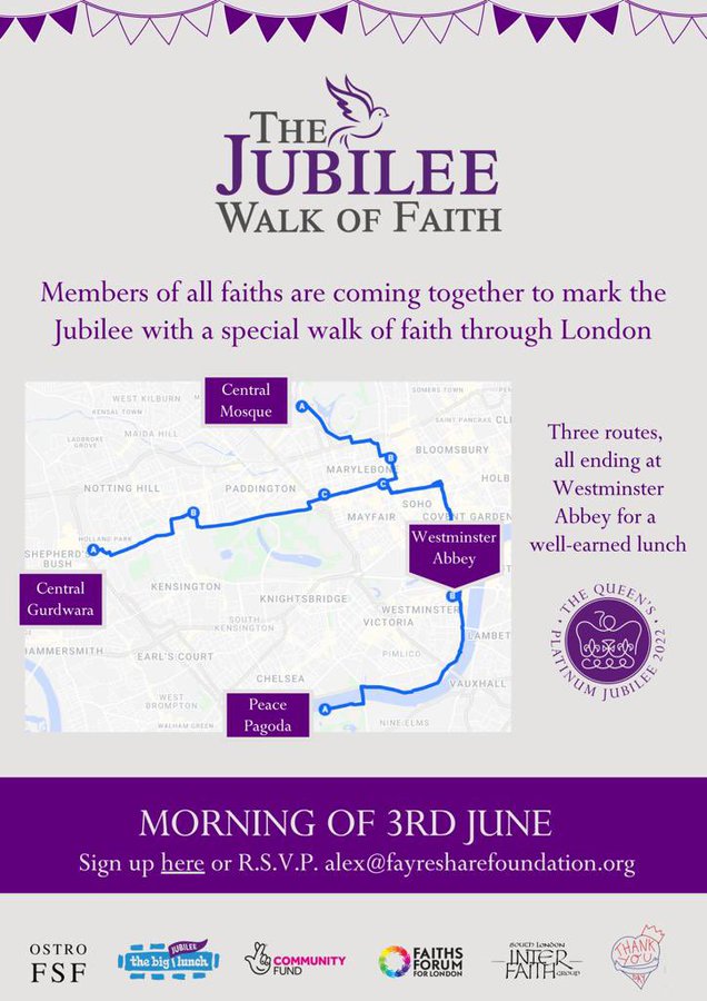 All are welcome to join people from many different faiths for this walk across London to mark the Queen’s Platinum Jubilee.