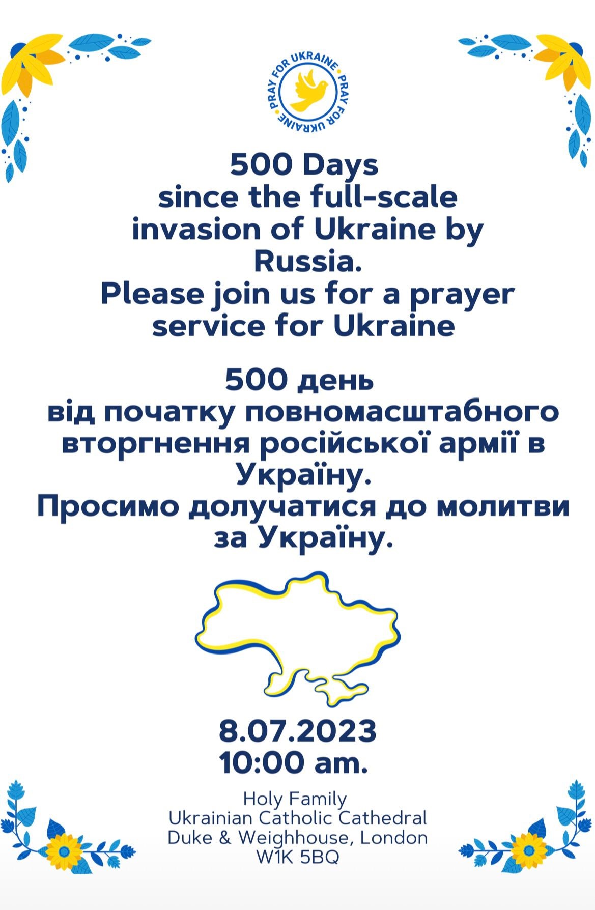 All are welcome to join the congregation of the Ukrainian Catholic Cathedral to mark 500 days since the Russian invasion of Ukraine. The service will be in English with music in Ukrainian.