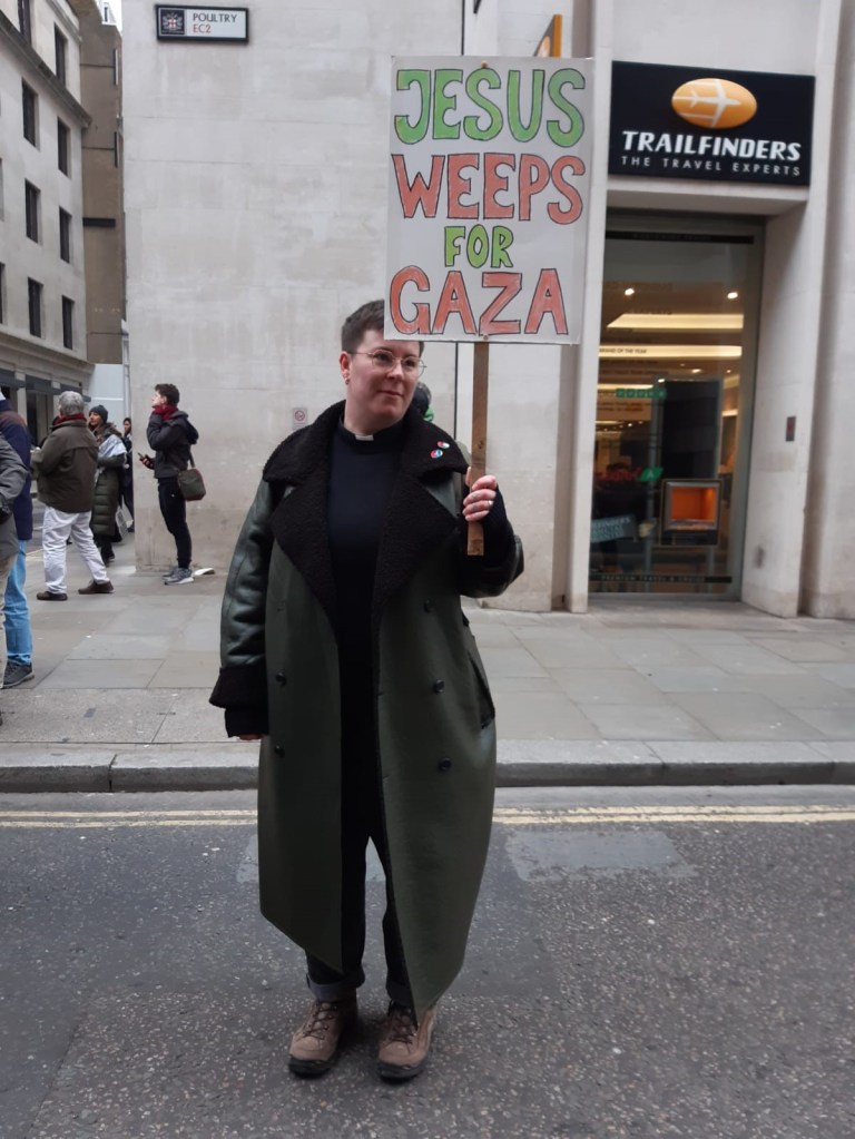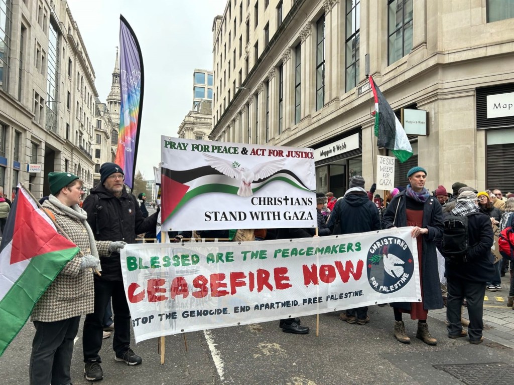 Columban Sisters Kate Midgley and Young Mi helped carry one of the Christian banners. Sr Mi said: “The reason I joined the demo is only a little gesture to show my solidarity towards suffering Palestinians. Because what is going on in Gaza and what Palestinians have to go through at this time is a total distortion of humanity.”