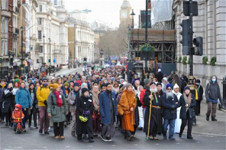 Hot foot from morning Mass, we arrived in Trafalgar Square to find that Prayers from the Faiths represented were already being offered. In this Vigil, beautifully organised by the Buddhists of Ticht nacht han’s Plum Village and the Quakers, the Walk was preceded by short prayer contributions by each Faith, after which there was a respectful pause and the gong of the Prayer bowl.
