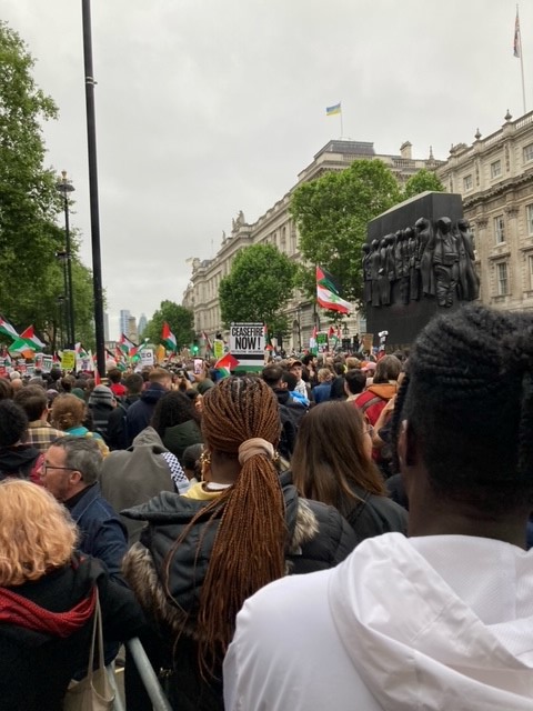 More than 10,000 people took part in a peaceful, last-minute rally in Downing Street yesterday, (Tuesday 28 May), in response to Israel’s horrific attacks on the tented refugee camp in Rafah, southern Gaza yesterday, which killed at least 50 people, mostly women and children, and injured hundreds more.