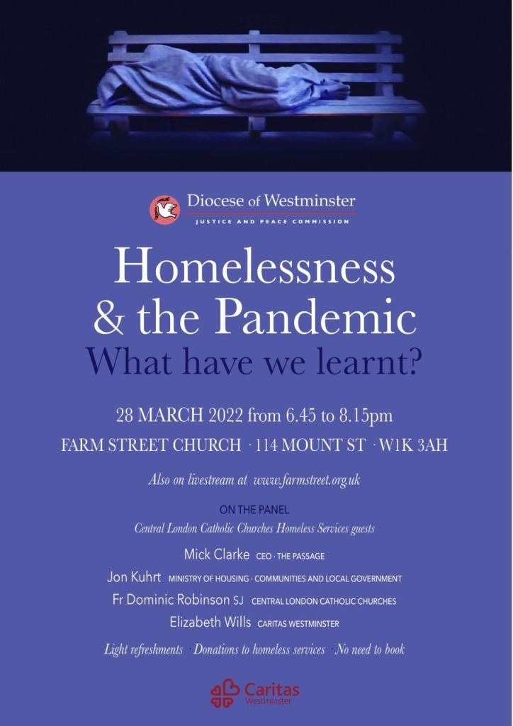 In March 2022, Westminster Justice & Peace together with Central London Catholic Churches hosted a panel discussion at Farm Street Church entitled ‘Homelessness and the Pandemic: what have we learnt?’