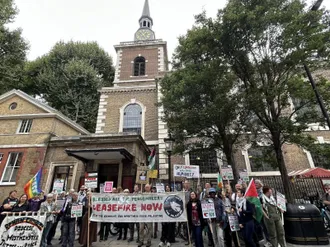 St James’ Piccadilly, was the gathering place for the Christian Bloc taking part in the 18th national march for Palestine in London on Saturday. Some participants, from churches of different denominations, came from as far away as Hertfordshire, Surrey and Sussex. After prayers together they joined the main march in Regent Street, walking alongside Jewish, Muslim and secular campaign groups, passing Hyde Park before ending near the Israeli embassy on Kensington Road. Organisers say more than 100,000 people took part.